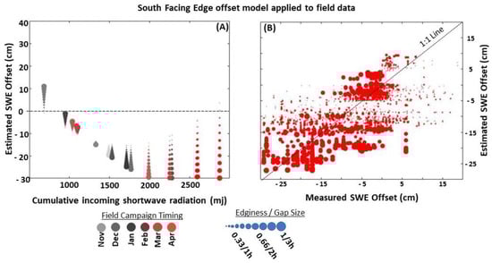 The left-hand panel (A) displays the estimated snow water equivalence (SWE) offset for south-facing edges of varying sizes (y-axis) during each field campaign in southwest Colorado from WY 2022 to WY 2023 as it relates to cumulative annual shortwave radiation (SWR) on the x-axis. The right-hand panel (B) displays the estimated SWE offset for south-facing edges (Equation (4)) vs. the measured SWE offset. The printed point size relates to the size of the edge in both tiles. On the left-hand panel, the color relates to the time at which the data were collected. Water year (WY) is defined as October 1 through September 30th of the following year.