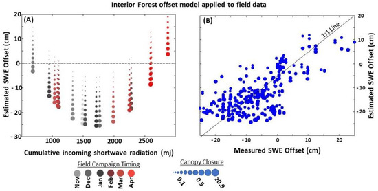 The left-hand panel (A) displays the estimated snow water equivalence (SWE) offset for the interior forest of varying sizes defined by canopy closure (y-axis) during each field campaign from WY 2022 to WY 2023 as it relates to cumulative annual shortwave radiation (SWR) on the x-axis. The right-hand panel (B) displays the estimated (Equation (5)) SWE offset for the interior forest vs. the measured SWE offset. The printed point size relates to canopy closure in both panels. On the left-hand tile, the color relates to the time at which the data were collected. Water year (WY) is defined as October 1 through September 30th of the following year.