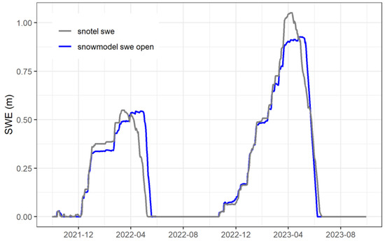 The model’s results are publicly available, and further details can be found within a supplemental data release [62]. Observations of air temperature and precipitation collected by the Spud Mountain SNOTEL station were used to evaluate the meteorological forcing of SnowModel simulations during the months of October through April for each water year. Both simulated SnowModel precipitation and air temperature exhibited a low bias when compared to observations. Therefore, SNOTEL station observations were used to adjust the mean bias of the NLDAS-2 meteorological forcing data. This correction was necessary due to differences in scale between the NLDAS-2 and SnowModel grid and highlights challenges associated with NLDAS-2 forcing data to represent orographic precipitation and cloud cover patterns across steep elevation gradients in complex mountainous terrain [58]. Precipitation correction factors (multipliers) of 1.565 and 1.434 and air temperature adjustments (offsets) of 3.21 °C and 1.15 °C were implemented for the WY 2022 and WY 2023 simulations, respectively. Furthermore, observations of incoming shortwave radiation collected by the CSAS Swamp Angel station (Figure 4) were used to evaluate shortwave radiation inputs simulated using SnowModel. Simulated incoming shortwave radiation compared well to observations during WY 2022 but was biased high during WY 2023 due to the above average cloudy sky conditions. To adjust for this bias, we implemented the cloud fraction adjustment parameter [52] value of 0.98 and 1.8 for WY 2022 and WY 2023. Following these bias corrections, simulated SWE (for an open land cover) at the Spud Mountain SNOTEL station was reasonably well correlated with observations (R2 = 0.78 and 0.95 for WY 2022 and 2023, respectively) and exhibited a RMSE of 10 and 8 cm during WY 2022 and WY 2023, respectively, for all time periods when either the simulated SWE or observed SWE was greater than zero (Figure 9).
