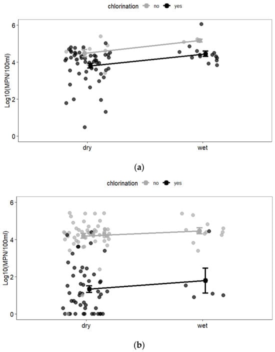 Interaction plot showing Log10 E. coli data in the exit effluents under different weather conditions (dry, wet) and chlorination treatment (yes, no), separately for each WWTP: (a) WWTP1, (b) WWTP2. Error bars represent mean ± standard deviation of data distribution for each group.
