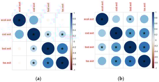 Spearman correlation matrix for E. coli, COD, BOD5, and TSS in the chlorinated effluents, separately for each WWTP: (a) WWTP1 (66 data for each variable) and (b) WWTP2 (56 data for each variable). Asterisk represents the statistical significance (p) at 0.05 level.