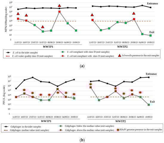 The relationship between index pathogens and their microbial indicators is depicted in Figure 4, separately for Salmonella and E. coli (Figure 4a) and HAdV and somatic coliphages (Figure 4b). Regarding bacteria, E. coli values at the exit were dichotomized according to water quality for class D reuse (1.0 × 104 MPN/100mL) and they were related to Salmonella presence in the same samples, showing a significant association between Salmonella absence at the exit and E. coli compliance for class D (Fisher exact test, p < 0.01). Regarding viruses, somatic coliphages were dichotomized according to the median values of the distribution data at the exit of the WWTPs (4.9 × 103 PFU/L), given the lack of threshold requirements for viral indicators. In this case, the association between HAdV absence and coliphages compliance was not significant (Fisher exact test, p = 0.4).