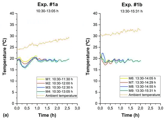 Experiment #1a was carried out between 10:30 h and 13:05 h, under a total sun exposure of 2 h and 35 min (2.58 h). In contrast, experiment #1b was conducted between 13:30 h and 15:31 h, under a total sun exposure of 2 h and 1 min (2.02 h). This led to a cumulative UV dose of 37.02 Wh/m2 and 37.06 Wh/m2, respectively. The maximum value of global irradiance in the horizontal plane reached in Exp. #1a was 780.63 W/m2, with an average of 628.64 W/m2, together with a maximum UV irradiance of 36.32 W/m2 and an average value of 28.47 W/m2. Exp. #1b exhibited higher values, with maximum global solar irradiance of 816.16 W/m2 and a UV irradiance of 37.87 W/m2, with respective average values of 793.25 W/m2 and 36.45 W/m2. Similarly, experiment #2a also took place between 10:30 h and 13:05 h (2.58 h duration). Experiment #2b was conducted between 13:30 h and 15:26 h, under a total sun exposure of 1 h and 56 min (1.93 h). Thus, a cumulative UV dose of 29.54 Wh/m2 and 29.45 Wh/m2 was achieved, respectively. Exp. #2a obtained a maximum global irradiance of 653.13 W/m2 and a UV irradiance of 30.00 W/m2. Respectively, the average values were 511.46 W/m2 and 22.72 W/m2. In contrast, Exp. #2b reached higher values for the maximum global irradiance of 681.01 W/m2 and an average of 661.30 W/m2, as well as for the maximum UV irradiance of 31.41 W/m2 and an average of 30.20 W/m2. Finally, experiment #3a was carried out between 10:30 h and 13:05 h (like tests #1a and #2a, with a total duration of 2.58 h), while experiment #3b was conducted between 13:30 h and 15:33 h, under a total sun exposure of 2 h and 3 min (2.05 h). In this test, the highest UV doses were reached with 47.15 Wh/m2 and 47.08 Wh/m2, respectively. Exp. #3a showed a maximum global irradiance of 950.09 W/m2 and an average value of 787.94 W/m2. During the spring test, the highest UV irradiance values were reached with a maximum of 44.75 W/m2 and an average value of 36.63 W/m2. On the other hand, Exp. #3b reached higher values for the maximum global irradiance of 1000.42 W/m2 and an average of 980.66 W/m2, as well as the maximum UV irradiance of 47.09 W/m2 and an average of 45.91 W/m2.