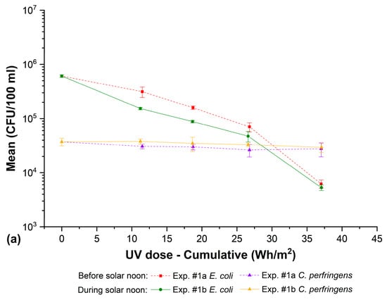 In order to carry out the experiment, first of all, and taking into account that the weather forecast was stable and with very similar characteristics to the day of the experiment, a few days before each experimental test, prior analyses were carried out (data not shown) of the climatological parameters (see Section 2.2). Based on the exposure time and the collected data of solar radiation intensity (recorded in units of W/m2 every 60 s), the UV radiation doses throughout the day were calculated and the necessary estimates were made for the sampling time points, which have been used for each test. These calculations were adjusted to the hours of highest solar radiation between 10:00 a.m. and 16:00 p.m. For the first trial (a), a specific time interval of 2.58 h was set to allow adequate solar disinfection of the waste effluent in order to verify the reciprocity law, without the intention of obtaining high quality. Thus, from the data obtained in the trial performed before solar noon, the time required to reach the same dose of UV radiation for the test that took place during solar noon (second trial (b): approx. 2 h) was calculated. The ultraviolet (UV) radiation dose was calculated as follows: