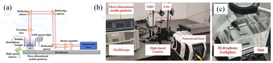The experimental setup for LICB fabricating micro-dimple formation is shown in Figure 1. This platform comprised a Nd: YAG solid-state pulsed laser (Nimma Extra, Beamtech, Shenzhen, China), a high-speed camera (V2012, Phantom, Los Angeles, CA, USA), a fiber-optic hydrophone system (V2, PA, Santa Clara, CA, USA), a high-performance oscilloscope (DSO91304A, Agilent, Santa Clara, CA, USA), optical components, and a workbench.