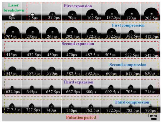 The evolution of a cavitation bubble with 500 mJ laser energy is shown in Figure 3. The laser power density exceeding the breakdown threshold of water induced the generation of high-temperature and high-pressure plasma, which rapidly expands near the sample, forming a hemispherical bubble [,,]. It can be observed from Figure 3 that laser irradiation on the sample surface resulted in the generation of plasma, which rapidly expanded, leading to the formation of an initial cavitation bubble. Due to the pressure difference inside and outside the bubble, the bubble began to undergo evolution. During the initial evolution period, the bubble expanded to its maximum radius (see 2.5 μs–202.5 μs), then contracted until it finally collapsed (see 205 μs–412.5 μs). During the contraction phase, different velocities on the upper and lower surfaces of the bubble, due to the solid boundary, resulted in collapse when the upper surface reached the lower surface. The shock wave generated by the collapse of the bubble acted on the surface of the 7050 aluminum alloy, with the period of the first bubble evolution being 412.5 μs. At the end of the first evolution period, the collapse shock wave led to the formation of an irregular hemispherical bubble [,]. During the second evolution period, the bubble irregularly expanded and contracted, ranging from expansion (see 415 μs–542.5 μs) to contraction–collapse (see 545 μs–630 μs), with a shortened evolution period duration of 217.5μs. The third evolution period occurred from expansion (see 632.5 μs–715 μs) to contraction (see 717.5 μs–795 μs), with an evolution period duration of 165 μs. The LICB underwent three periodic evolutions before eventually dissipating in the liquid.