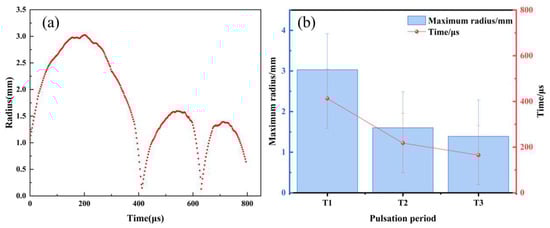 The relationship between the evolution size and time of cavitation bubble with 500 mJ laser energy is shown in Figure 5. Figure 5a presents the dynamic radius of the cavitation bubble, while Figure 5b shows the maximum radius of the cavitation bubble at different periods along with the evolution time. It can be observed from Figure 5 that the total duration of the three evolution periods of the cavitation bubble is 795 μs, with the durations of the first, second, and third evolution periods being 412.5 μs, 217.5 μs, and 165 μs, respectively. The decrement rates are 47.27% and 24.14%, with the rate of decrease gradually slowing down. The maximum radius of the cavitation bubble during the first, second, and third evolution periods are 3.03 mm, 1.60 mm, and 1.39 mm, respectively. The reduction rates were 47.19% and 13.13%, with the rate of decline gradually slowing down. The process of LICB underwent three periodic evolutions, with each successive evolution decreasing in duration and maximum radius until the cavitation bubble collapsed. It can be inferred that most of the laser energy and bubble energy were consumed during the first evolution period, and the impact of the shock wave generated during the third collapse was relatively small.