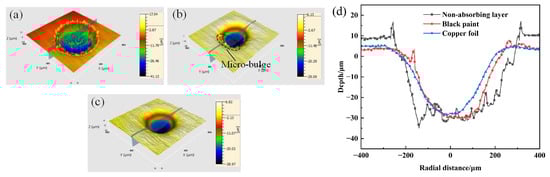 Surface morphologies of micro-dimple under different absorption layers. (a) Non-absorption layer; (b) black paint; (c) copper foil; (d) two-dimensional cross-section diagram.