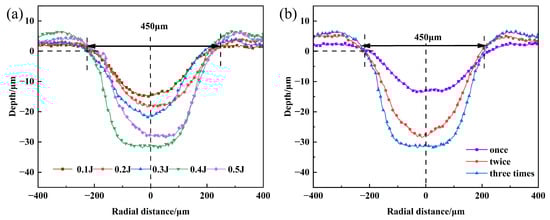 Based on the experimental results of Section 3.3.1, a 100 μm thick copper foil was selected as the absorption layer. The influence of laser parameters on the diameter and depth of the micro-dimple was studied by varying the laser energy and the number of impacts. The contour profiles of the micro-dimple induced by LICB impacts under different laser parameters are shown in Figure 9. The cross-sectional morphology of micro-dimples obtained by repetitively subjecting them to impacts with different laser energy levels three times is shown in Figure 9a. It can be observed from Figure 9a that under the influence of LICB at varying laser energy levels, the maximum diameter of the upper part of the micro-dimple is approximately the same, at around 450 μm. As the energy distribution of the laser spot follows a Gaussian distribution, the laser plasma shock wave and cavitation collapse shock wave were unevenly distributed. The pressure of the shock wave decreased as one moves closer to the edge of the laser spot, resulting in the micro-dimple diameter being slightly lower than the spot diameter of 500 μm. Among these, when the energy ranges from 100 to 400 mJ, the depth of the micro-dimple gradually increases. However, when the laser energy reaches 500 mJ, the maximum depth of the micro-dimple begins to decrease and deviate from the center of the beam spot. Based on the studies by scholars Sollier [] and Wang [], it can be inferred that the plasma shielding effect impedes the effectiveness of laser radiation. In conclusion, the optimal effect of the LICB micro-dimple is achieved with a laser energy of 400 mJ.