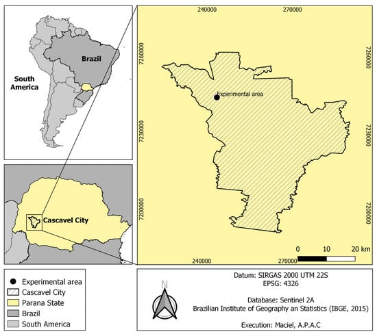 The experimental area is situated at the Experimental Nucleus of Agricultural Engineering (NEEA) at the State University of Western Paraná in Cascavel, Paraná, Brazil (Figure 1). The geographical coordinates of the area are 24°54′2.30″ S 53°31′59.72″ W, and it has an altitude of 760 m.