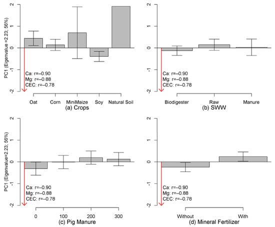 Averages and 95% confidence intervals (bars) for the values of the first principal component (PC1) in relation to crops (a), swine wastewater—SWW (b), pig manure (c), and mineral fertilizer (d). Variables associated (Ca = calcium, Mg = magnesium, CEC = cation exchange capacity) with PC1 and their respective correlations are shown next to the direction of the association (red arrow).
