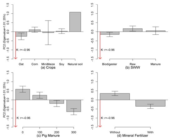 Averages and 95% confidence intervals (bars) for the values of the second principal component (PC2) in relation to crops (a), swine wastewater—SWW (b), pig manure (c), and mineral fertilizer (d). The variable associated (K = potassium) with PC2 and its respective correlation is shown next to the direction of the association (red arrow).