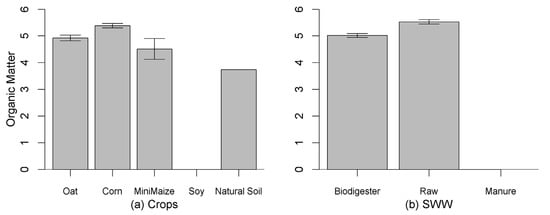 Averages and 95% confidence intervals (bars) for organic matter values in relation to crops (a) and swine wastewater (b).