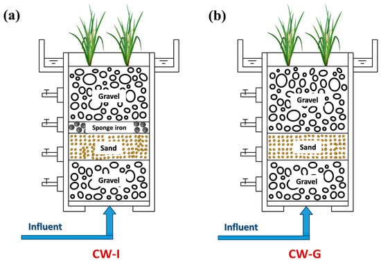 The experiment established two laboratory-scale vertical upward-flow constructed wetland systems (CW-I, CW-G), and the device was 55 cm in height and had an interior diameter of 30 cm, composed of biological glass, as illustrated in Figure 1. The overall volume of the device was 40.25 L and the effective volume was about 21.5 L. Yellow calamus was planted in the device, with 4–5 robust plants per unit. The main body of CW-G was filled from top to bottom with 15 cm gravel, 10 cm sand, and 25 cm gravel successively, with gravel particle sizes of 8–12 mm and sand particle sizes of 0.5–2 mm. The installation of CW-I was identical to that of CW-G, with the addition of sponge iron above the sand layer. The composition of simulated effluent from the wastewater plant is as follows: 14.7 ± 1.5 mg/L TN, 5.6 ± 1.1 mg/L ammonia (-N), 10.8 ± 1.4 mg/L nitrate (-N), and 0.5 mg/L TP (KH2PO4). To change the pH of the simulated wastewater, 0.1 M NaOH and HCl were introduced.