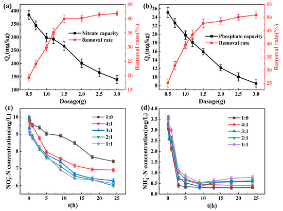 The effect of dosage on pollutant removal: (a) -N; (b) -P. The effect of Fe/C ratios on pollutant removal: (c) -N; (d) -N.