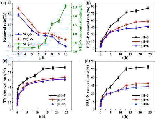 (a) Effect of initial pH on -N, -N, and -P co-removal efficiency; The kinetic effect of different initial pH levels on the removal of (b) -P, (c) TN, and (d) -N.
