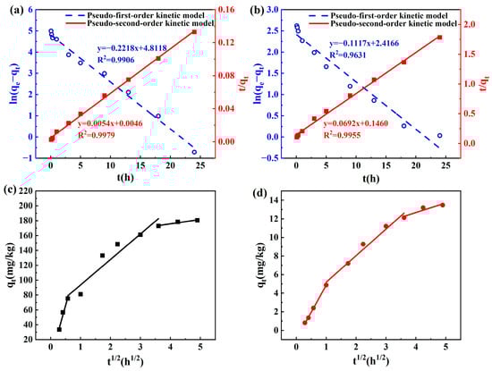 The kinetic fitting curves of (a) TN and (b) -P; The intra-particle diffusion fitting curves of (c) TN and (d) -P.