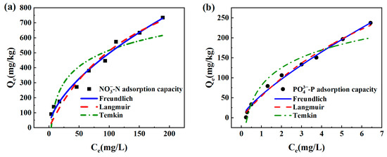 Adsorption isotherms of sponge iron fit by Langmuir, Freundlich, and Temkin for co-adsorption of (a) -N and (b) -P.