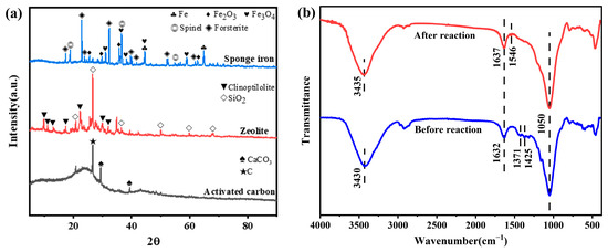 (a) XRD spectra of sponge iron and activated carbon; (b) FTIR spectra of the samples before and after co-removal.