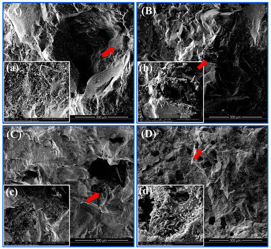SEM images of the sponge iron samples (A,a) before the reaction and after the reaction at (B,b) pH = 7, (C,c) pH = 3, and (D,d) pH = 10.
