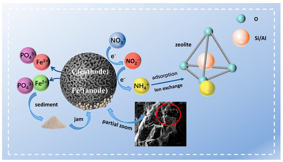 The main mechanism of nitrogen and phosphorus co-removal in adsorption experiments was deduced based on experimental results and material characterization, as illustrated in Figure 8. Firstly, protons and were adsorbed on the sponge iron surface when it is introduced to solutions, and sponge iron also released electrons for -N reduction. -N was reduced to -N and Fe0 was oxidized to Fe3+ and Fe2+. Then, according to the free diffusion theory, phosphate ions in the solution easily diffused to the area with a low concentration. The iron ions constantly dissolving on the sponge iron surface and the phosphate radicals were polar molecules, attracting each other to produce Fe3(PO4)2 and FePO4. The solubility products of Fe3(PO4)2 and FePO4 are very small. Therefore, it was easy for them to precipitate and separate from the solution, so as to achieve phosphorus removal. In addition, zeolite removed ammonia nitrogen by cation exchange and physical adsorption.