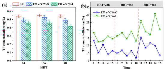 The performances of TP removal in CW-G and CW-I at different HRTs: (a) TP effluent concentration; (b) TP removal efficiency.