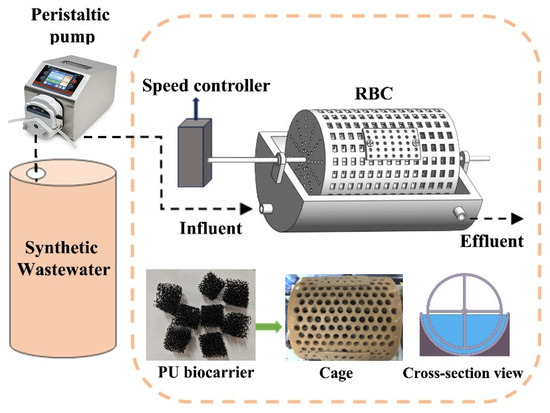 To inoculate the RBC reactors, the biological carriers were initially placed in a cylindrical device (R = 50 mm, H = 400 mm) with a bottom water outlet. Activated sludge with a mixed liquor suspended solids (MLSS) concentration of 6500 mg/L, obtained from the aerobic tank of the Jingkou Sewage Treatment Plant (Zhenjiang City, Jiangsu Province, China), served as the inoculum and circulated through the cylindrical device at a flow rate of 0.03 mL/s for 7 days. Regular addition of nutrients (similar in concentration to the synthetic wastewater) to the sludge was employed to ensure biomass attachment and growth.