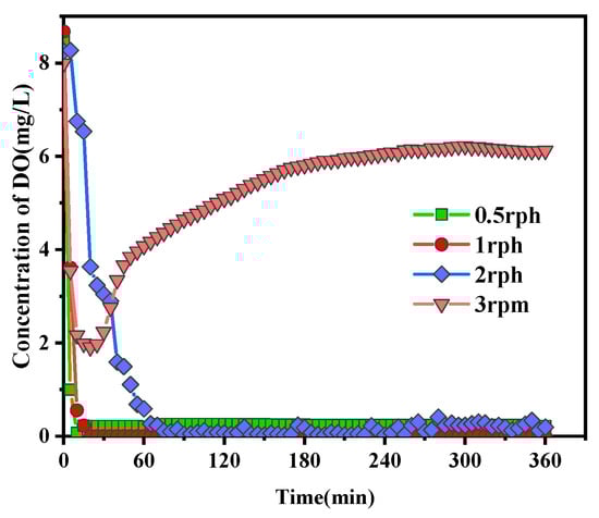 After the biofilm carriers were loaded into the P-RBC and T-RBC reactors, synthetic wastewater was subsequently pumped into the reactor for 5 min using a peristaltic pump. Then, the HRT was set at 6 h, and a solenoid valve, timed to open for 5 min at the cycle’s end, was employed to ensure a complete wastewater discharge. During the treatment, the reactors were operated under pulse-rotating and typical continuous-rotating modes, named P-RBC and T-RBC, respectively. For the P-RBC, during the 6 h treatment, the reactor was operated as follows: 1 min rotating for a half round followed by a defined period of idle state ranging from 59 min to 14 min (e.g., 59, 29, and 14 min), representing various average rotating speeds ranging from 0.5 to 2 rounds per hour, accordingly (see Figure S1). The operating temperature of the reactor was maintained at 25 ± 2 °C. As the P-RBC was at an idle state for most of the time, the dissolved oxygen (DO) of the wastewater in the bioreactor was always below 0.05 mg/L during the treatment (See Figure 2). For T-RBC, the same filling and draining procedures were implemented; however, during the treatment, the T-RBC reactors operated continuously at a rotational speed of 3 rpm. In this case, the oxygen profile of the wastewater ranged from 1.91 mg/L to 7.99 mg/L (See Figure 2).