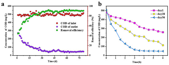 The COD concentrations in the influent and effluent, along with the COD removal efficiency of the P-RBC, are presented in Figure 3a. The synthetic wastewater used in this study had an average COD content of approximately 500 mg/L, with the influent volume to the reactor set at 4 L. The HRT of the system was established at 6 h, and the average rotational speed was initially set at 0.5 rounds per hour (rph). The hydraulic loading rate (HLR), organic loading rate (OLR), and nitrogen loading rate (NLR) were set at 0.71 m3/m2/d, 2.0 kgCOD/m3/d, and 0.16 kgN/m3/d, respectively. The COD removal efficiency exhibited a progressive increase, reaching 42.59%, 73.76%, and 90.26% on day 1, day 28, and day 56, respectively, attributed to the acclimation period of the sludge (Figure 3b). Subsequently, the COD removal efficiency stabilized at around 90%, and the sludge retention time (SRT) was about 180 days. This enhancement in COD removal of the P-RBC under anaerobic conditions is likely due to improved intercellular organic carbon storage by enriched Poly-β-hydroxyalkanoate accumulating organisms if methanogenesis is excluded [26,27]. At the same time, when T-RBC ran for 42 days, the average removal rate of COD was 94.7% (see Figure S2).