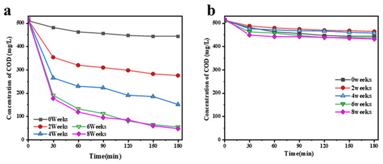 As illustrated in Figure 4a, the biofilm sampled from the P-RBC, which was operated under sequential anaerobic and aerobic conditions, demonstrated an increasing capacity of anaerobic COD removal. The maximum speed of COD removal (during the first 30 min of the COD removal test) of the P-RBC biofilm at week 0 was approximately 57.8 mg/L/h, which experienced a significant increase to 673.2 mg/L/h after 6 weeks of operation. In comparison, the biofilm sampled from the T-RBC demonstrated a considerably constant low COD removal rate, achieving only about 83.64 mg/L/h after 8 weeks of operation (Figure 4b). The increasing anaerobic COD removal capacity suggests the enrichment of PHA-accumulating organisms, such as GAOs and polyphosphate-accumulating organisms (PAOs). Previous research indicates that GAOs tend to become dominant microorganisms in a bioreactor system that is operated under sequential anaerobic storage and subsequent biomass exposure to air conditions [27]. A GAO’s ability to synthesize PHAs from carbon sources during the anaerobic stage [16] suggests that the successful enrichment of GAOs is likely the primary factor underlying the superior COD removal capacity of biofilms in the P-RBC under anaerobic conditions.