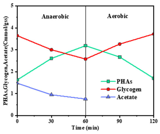 Temporal shifts in PHAs, glycogen, and acetic acid concentrations during an anaerobic–aerobic cycle.