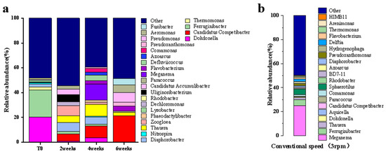 (a) OTU’s abundance for genus-level classification of biofilm in P-RBC after 2, 4, and 6 weeks of operation; (b) OTU’s abundance for genus-level classification in T-RBC of biofilm in T-RBC after 6 weeks of operation.