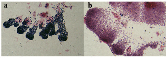 Microscopic observations from Sudan Black B (SBB) staining of P-RBC biofilms are also presented in Figure 8. SBB is known for its ability to stain intracellular lipid granules, turning them black and enabling the qualitative assessment of PHA synthesis and accumulation within cells. As depicted in Figure 8, after the 1 h anaerobic phase, cells predominantly exhibited a coarse rod shape, with lipid granules appearing black under SBB staining (Figure 8a). This observation indicates significant PHA accumulation within the biofilm. Conversely, during the 1 h aerobic phase, cells were primarily slender, rod-shaped, and red (Figure 8b), lacking the characteristic black staining of PHAs. This lack of staining suggests the degradation of PHAs during the aerobic phase. These findings are in agreement with those reported by Crocetti et al. [40], corroborating the cycle of PHA synthesis under anaerobic conditions and degradation under aerobic conditions within the microbial community.