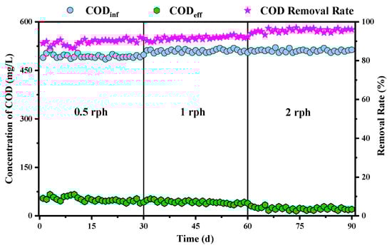 To assess the impact of rotation frequency on reactor performance, experiments were conducted at rotating rates of 0.5, 1, and 2 rounds per hour (rph), with a constant HRT of 6 h and an influent COD concentration of approximately 515 mg COD/L, using acetate as the carbon source. As depicted in Figure 9, COD removal efficiencies at 0.5, 1, and 2 rph were 90.2%, 93.9%, and 94.7%, respectively, demonstrating an improvement in COD removal as the rotation frequency increased. This enhancement could be possibly attributed to the higher frequency of osculation between the anerobic and aerobic phases, facilitating faster consumption of PHAs and resulting in a more complete regeneration of the acetate removal capacity of the biofilm. Also, a high rotation frequency might lead to greater dissolved oxygen penetration in the water and biofilm, thus improving the aerobic metabolism. However, it is noteworthy that increasing the rotational speed from 0.5 to 2 rph, while improving COD removal by about 5%, resulted in a fourfold increase in energy consumption.