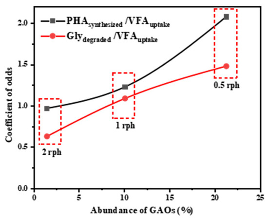 Additionally, this study observed a positive correlation between the PHAsynthesis/VFAconsumption ratio, the glycogensynthesis/VFAconsumption ratio, and GAO abundance. At rotational speeds of 0.5, 1, and 2 rph, the glycogensynthesis/VFAconsumption ratios were 1.48, 1.09, and 0.63, respectively, with corresponding GAO abundances of 21.34%, 10.56%, and 2.37%, as illustrated in Figure 10 and Supplementary Materials (see Figure S4A). These results corroborate with the literature, indicating that a prolonged osculating phase between anaerobic and aerobic conditions is conducive to GAO enrichment and thereby enhances COD removal efficiency in the P-RBC [44,45]. Considering these findings, it is evident a lower rotation frequency favors GAOs’ role in COD removal. Given the significant energy savings, operating at a lower-frequency rotation of 0.5 rph presents a viable and economically advantageous approach for COD removal in P-RBCs.