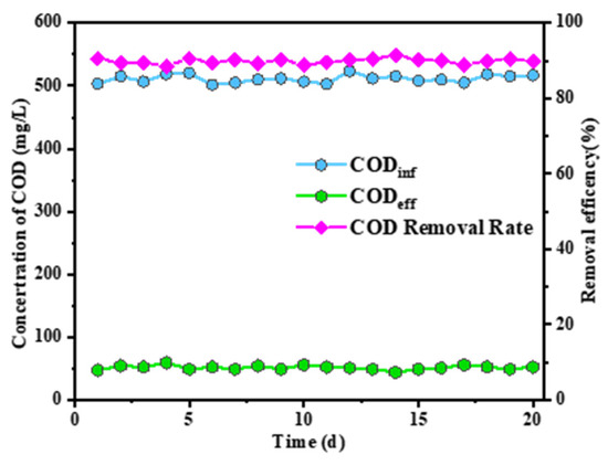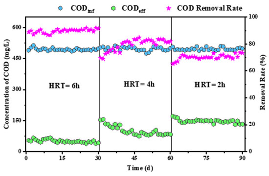 As presented in Figure 11, under a 6 h HRT, the P-RBC achieved a COD removal rate of about 90%, with COD concentration decreased to 50.9 mg/L. With HRT reduced to 4 h, the COD removal efficiency dropped to approximately 77.9%, and further reduction to a 2 h HRT resulted in a COD removal rate of about 70.5%. These results underscore the significance of HRT in enhancing biofilm biomass and microbial contact time with substrates, directly correlating with improved COD removal rates.