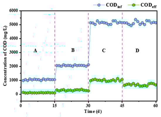 To assess the P-RBC performance in treating high-concentration organic wastewater, the system was tested with influent COD concentrations increased to 2, 4, and 10 times the normal acetate concentration. As shown in Figure 13, during stage A (0–15 days) with an influent COD concentration of 1016 ± 25 mg/L (ORL of 4.06 kgCOD/m3/d), the system achieved an average effluent COD concentration of about 96.4 mg/L, resulting in a COD removal efficiency of approximately 90.5%. In stage B (15–30 days), with an influent COD concentration of 2025 ± 30 mg/L (ORL of 8.10 kgCOD/m3/d), the efficiency slightly dropped to 85.7%. During stage C (30–42 days), with an influent concentration of 5060 ± 55 mg/L (ORL of 20.24 kgCOD/m3/d), an average effluent COD concentration of 992 ± 49 mg/L was achieved, leading to a COD removal efficiency of around 80.4%. The results show that the P-RBC demonstrated robust COD removal capabilities, exceeding an 80% efficiency, even under high organic loading conditions. Notably, extending the HRT from 6 to 12 h in stage D could improve the COD removal efficiency to 88.8% in the presence of an extremely high organic load (COD = 5060 ± 55 mg/L, and ORL = 10.12 kgCOD/m3/d), showcasing the process’s efficacy in managing wastewater with elevated organic pollutant levels.