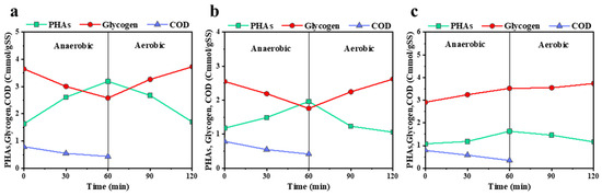 In practical applications, wastewater typically contains different organic carbon sources. This study extends its investigation to examine how different influent carbon sources, specifically glucose, sodium propionate, and sodium acetate, affect the changes in organic carbon, PHAs, and glycogen in the P-RBCs. An analysis was conducted on water and biofilm samples collected during the initial anaerobic–aerobic alternation of a typical wastewater cycle. The results are detailed in Figure 14a–c.