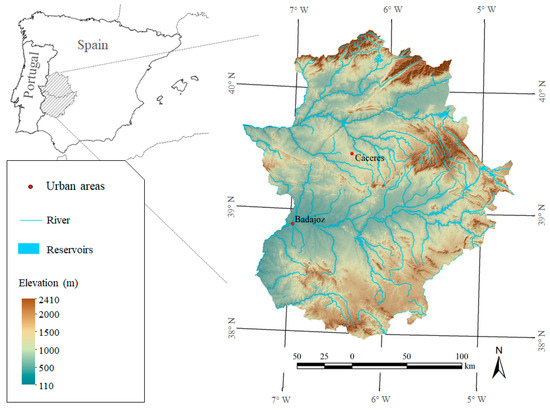 The Spanish region of Extremadura has a surface area of approximately 41,600 km2 and elevations ranging from 2400 to 150 m (Figure 1), with a mean elevation of 430 m (the standard deviation is 188 m). Its population slightly surpasses one million inhabitants and is distributed in small cities and scattered villages.