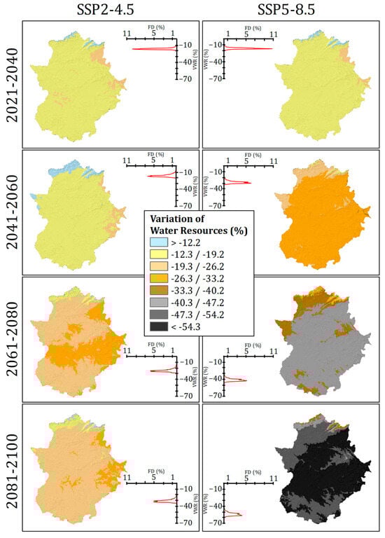 Changes (%) in water resources of Extremadura in different scenarios and periods. Maps were obtained by calculating differences between multi-model mean and the historical baseline period (1970–2000). Histograms were obtained from values of pixels of these maps. FD = Frequency distribution (%); VWR = Variation of water resources (%).