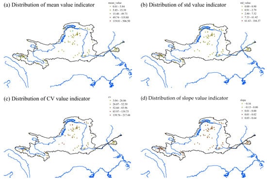 Figure 2 shows the spatial distribution characteristics of the mean surface area, standard deviation (std), coefficient of variation (CV), and slope of 151 natural lakes in the Yellow River Basin over 37 months.