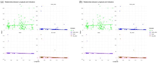 Analysis of the relationship models between various indicators and geographic coordinates (Figure 3 and Table 1) indicates that most indicators show either minimal explanation for data variability or lack statistical significance in relation to latitude and longitude. This may suggest that these indicators are less influenced by geographic coordinates or that other unconsidered factors are affecting them. Models of standard deviation against latitude, standard deviation against longitude, and slope against longitude revealed some statistical significance, especially the relationship between standard deviation (Std_value) and longitude, which was most pronounced. This suggests that data variability (standard deviation) and change trends (slope) might vary to some extent across different geographic locations.