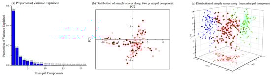 Figure 4b illustrates the distribution of sample scores along the first principal component (principal component 1, horizontal axis) and the second principal component (principal component 2, vertical axis). The biplot in Figure 4b displays the dispersion of samples primarily along the horizontal axis, captured by PC1, which accounts for the largest proportion of variability. In contrast, PC2 reveals the second-largest proportion of variability along the vertical direction. PC3 offers an additional perspective on the distribution of data points in the depth dimension (Figure 4c).