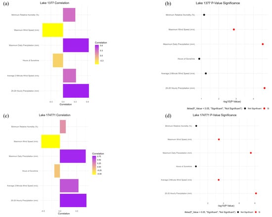 Similarly, for HyLake_ID 174771, significant correlations are observed between meteorological factors and lake surface area. “20-20 hourly precipitation” shows a strong positive correlation with the lake surface area (correlation coefficient of 0.788, p-value < 0.01), reinforcing the idea that precipitation is a critical factor in lake surface dynamics. Unlike Lake 1377, “maximum wind speed” for Lake 174771 exhibits a slightly weaker negative correlation with the lake surface area (correlation coefficient of −0.553, p-value < 0.01), which may indicate a different impact of wind on smaller lakes. Furthermore, “hours of sunshine” and “maximum daily precipitation” have substantial positive correlations with the lake surface area, with correlation coefficients of 0.766 (p-value < 0.01) and 0.1745 (p-value = 0.302), respectively. The correlation between “minimum relative humidity” and lake surface area, similar to Lake 1377, remains weaker and not significant, with a correlation coefficient of 0.175 and a p-value of 0.302, indicating minimal impact on the lake’s size.