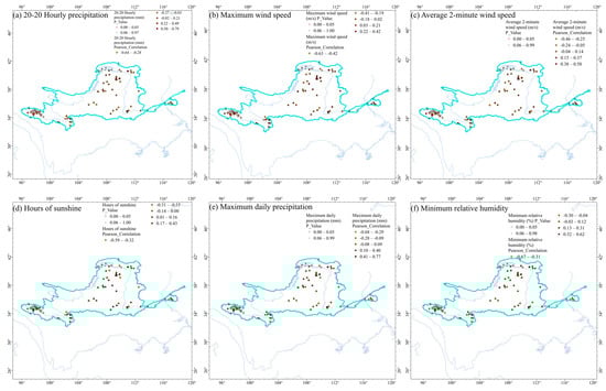 To elucidate the spatial distribution characteristics of the correlation and significance between lake surface areas and meteorological factors in the Yellow River Basin, we created a distribution map showing the correlation and significance between lakes in the Yellow River Basin and changes in meteorological factors, as illustrated in Figure 6. For the 20-20 hourly precipitation (mm), among 118 lakes, 38 exhibited significant correlations, with 22 positively correlated (correlation coefficients ranging from 0.41 to 0.79, average 0.59) and 16 negatively correlated (correlation coefficients ranging from −0.36 to −0.64, average −0.43). Spatially, lakes in the source region of the Yellow River generally showed a significant positive correlation. For maximum wind speed (m/s), 28 lakes showed significant correlations, with five positive and twenty-three negative correlations (correlation coefficients ranging from −0.34 to −0.63, average −0.47), indicating an overall negative correlation between lake surface area and maximum wind speed. For average 2-minute wind speed (m/s) and hours of sunshine, 25 and 22 lakes, respectively, showed significant correlations without a clear pattern. For maximum daily precipitation (mm), 36 lakes had 21 showing a positive correlation, indicating a positive correlation between lake surface area and daily precipitation in larger lakes. For minimum relative humidity (%), 24 lakes exhibited significant correlations but without a discernible pattern.
