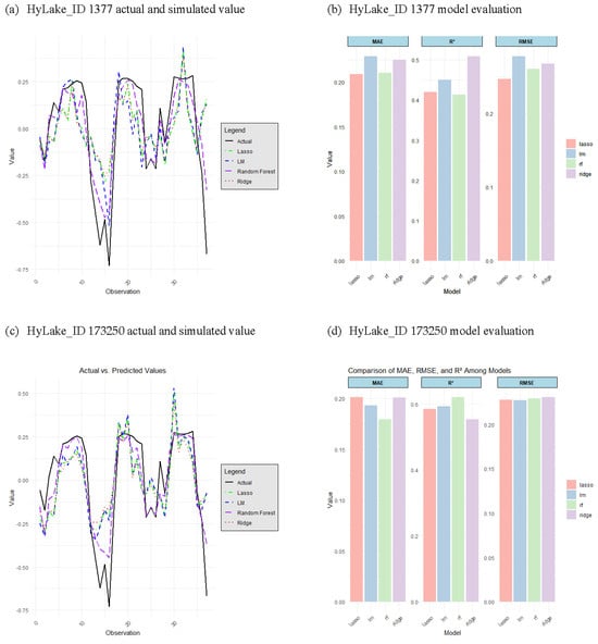 Taking Lake HyLake_ID 1377 (Ngoring, mean area = 506.500 km2) and HyLake_ID 173250 (mean area = 1.620 km2) as examples, the model analysis results are presented in Figure 7. For HyLake_ID 1377, the lasso model demonstrates the lowest average root mean square error (RMSE) of 0.247, outperforming other models in this analysis. Its consistent and low error rate across different validation sets indicates superior stability and generalization ability. In contrast, for HyLake_ID 173250, the linear regression model achieves the lowest average RMSE of 0.227, marking it as the best performer in this instance. This comparison highlights the variability in model responses across different lakes within the basin, underscoring the importance of model selection tailored to specific lake characteristics.