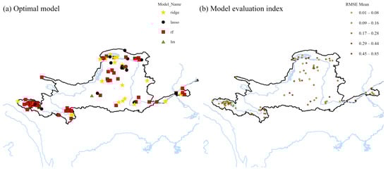 Figure 8 reflects the optimal model fitting results for the surface area of lakes in the Yellow River Basin. The random forest (RF) model performs best in 65 lakes, demonstrating its superiority in dealing with the relationship between the surface area of lakes in the Yellow River Basin and meteorological factors. The strength of the random forest model lies in its ability to handle a large number of input variables and automatically select variables, thus providing deep insights into complex data relationships. Ridge regression is best for 28 lakes, indicating that the introduction of L2 regularization can effectively improve the model’s predictive accuracy and stability when data exhibit multicollinearity. Lasso regression performs best for 20 lakes; its use of L1 regularization helps in simplifying variables and enhancing the model’s interpretability, which is particularly important in determining the impact of key meteorological factors on the changes in lake surface area. Although the linear model is only best for four cases, it remains the foundation for analyzing linear relationships, providing us with an initial benchmark for model comparison (Figure 7a). These results suggest that nonlinear models (such as RF) might be more suitable for capturing the complex dynamic relationships between the surface area of lakes in the Yellow River Basin and meteorological factors. The random forest model provides the best fit due to its ability to handle a large number of feature variables and consider their interactions, thereby offering the best fitting effect. Meanwhile, regularized linear models (lasso and ridge) demonstrate robustness in datasets with high multicollinearity, which is crucial for reducing model overfitting and improving prediction accuracy.
