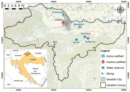 This research focused on a small segment of the WSS operated by Varkom Inc. in Varaždin County, northwestern Croatia (Figure 1). The whole WSS spans approximately 1600 km, comprising 20 reservoirs with a total volume of 19,500 m3, and supplies about 120,000 inhabitants []. Generally, there is no water treatment (except for one well that is filtered through activated carbon, but it is not situated in the study area).