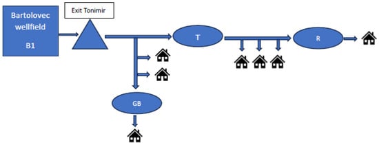 Schematic illustration of the selected segment of the WSS (B1—well; Tonimir—exit from the wellfield towards reservoirs (T—Tonimir, R—Rukljevina, GB—Golo Brdo)).