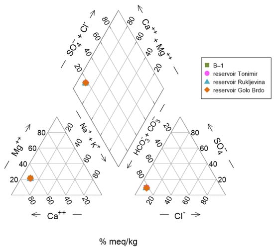 According to major ion composition, both reservoir waters and well B-1 waters have the same hydrochemical type, characterized as CaMg-HCO3, without pronounced differences on the Piper diagram (Figure 3).